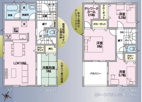 設計住宅性能評価書 / 建設住宅性能評価書(新築時) / 耐震構造 / フラット35・S適合証明書 / 土地50坪以上 / 市街地が近い / 閑静な住宅地 / 2階建 / 東南向き / 2面採光 / LDK15畳以上 / 和室 / フローリング / 人感センサー付照明 / フットライト / 24時間換気システム / 全居室収納 / 床下収納 / クローゼット / シューズボックス / システムキッチン / 対面式キッチン / カウンターキッチン / 浴室乾燥機 / 浴室に窓 / 追焚機能 / 浴室暖房 / シャワー付洗面化粧台 / トイレ2ヶ所 / 温水洗浄便座 / 室内洗濯機置場 / バルコニー / 南面バルコニー / ルーフバルコニー / 複層ガラス / 駐車2台可 / TVモニタ付インターホン / 防犯カメラ / フラット35Sに対応 / 都市ガス
